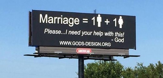 ![]() Hrišćanski par koji je radije prekinuo svoj posao sklapanja brakova nego da svoje usluge pruži gej parovima sada je odlučio da postavi hiljadu anti-gej bilborda širom Amerike. Dik i Beti Odgard su bili tuženi 2013. godine jer su bili odbili da u svojoj crkvi venčaju gej par. Nakon što su na sudu izgubili ovaj slučaj oni su odustali od toga da venčavaju ljude već su počeli da prikupljaju dobrovoljne priloge vernika sa ciljem da „obnove biblijsku definiciju braka u našem društvu". Njihov prvi zadatak koji su sebi postavili jeste da postave hiljadu bilborda širom Amerike na kojima su natpisi upereni protiv istopolnih brakova. Prvi bilbord je postavljen ovog jula u blizinu autoputa u Oklahomi.